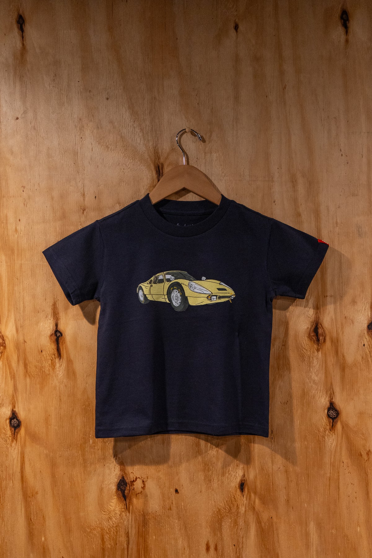 This is the Rahal 904 kids tee in midnight blue. Featuring Bobby Rahal's 1964 904 Carrera GTS in champagne yellow. Small Luftgekühlt logo on the back collar.
