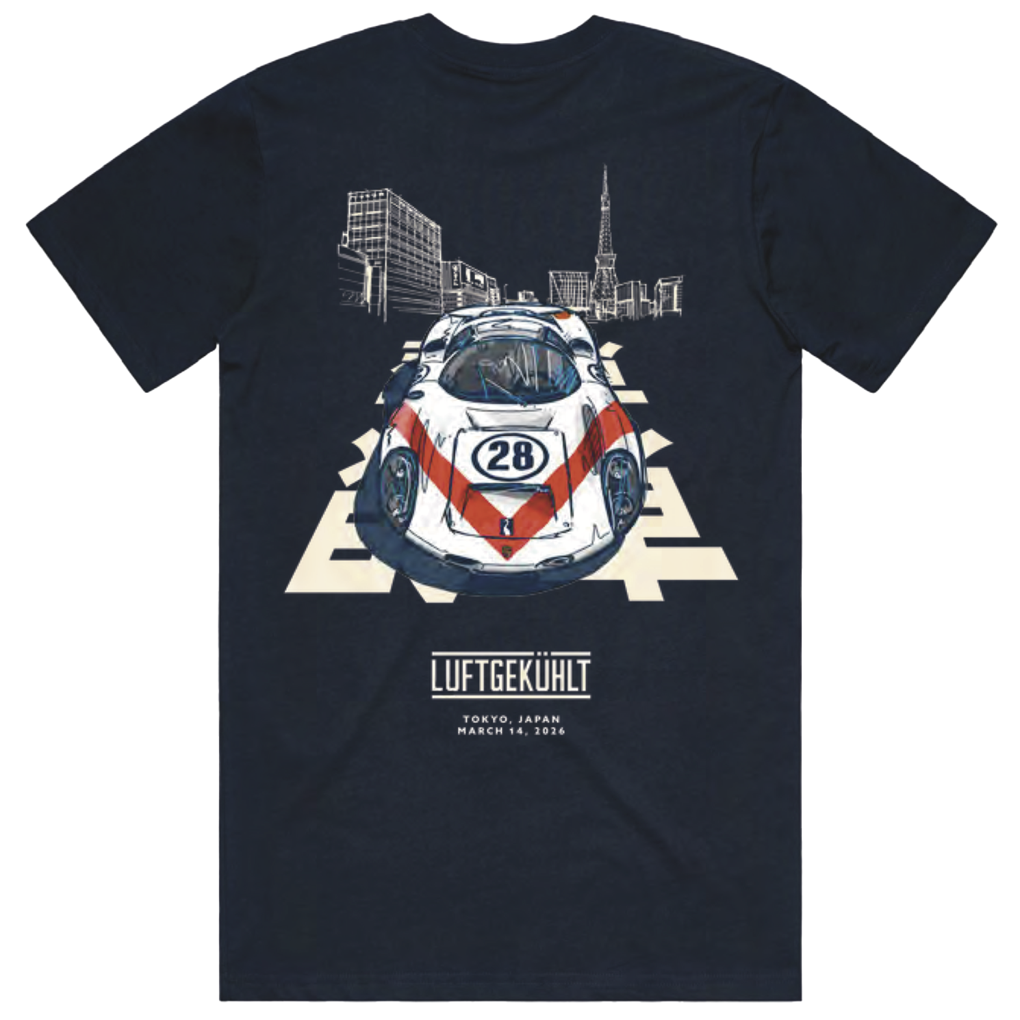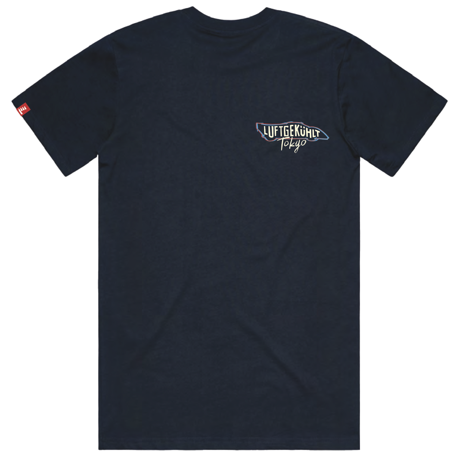 Luft Tokyo Event Art tee in Navy. Limited Luft Tokyo logo on the front and large Event poster inspired graphics on the back. Featuring Taki Racing Porsche 910 of Tetsu Ikuzawa.
